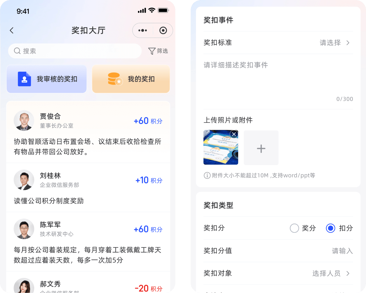 展示被獎(jiǎng)勵(lì)或扣除的員工積分,以激勵(lì)員工更好地完成工作。