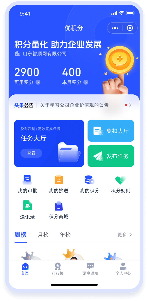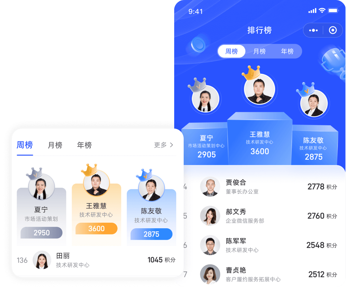 根據(jù)用戶獲得的積分?jǐn)?shù)量進(jìn)行排名,并展示在排行榜上。排行榜可以按照周積分、月度積分、年度積分不同維度來展示。能夠激發(fā)員工之間的競(jìng)爭(zhēng)意識(shí),鼓勵(lì)他們積極參與工作和行為的考核。