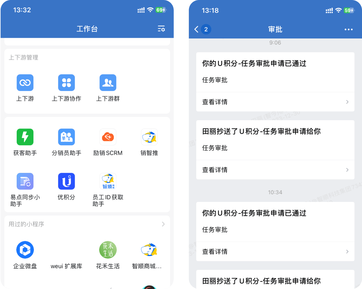 消息推送在企業(yè)微信里也及時(shí)提醒推送,使得員工可以及時(shí)收到來自同事、上級(jí)或下級(jí)的消息和通知